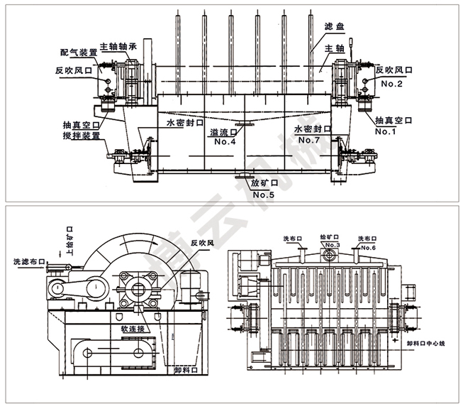 盤式真空過濾機由各個單獨的扇形片的圓盤構(gòu)成。每一個扇形片為 單獨的過濾單元,由濾布做成布套在扇形片上形成濾室。過濾盤由電機通過減速器及開式齒輪傳動來驅(qū)動 ,過濾盤順時針方向轉(zhuǎn)動,濾室里的礦漿在吸附區(qū)借助于真空泵在過濾介質(zhì)兩側(cè)形成的壓力差,附著在過 濾盤上形成濾餅后,攪拌器旋轉(zhuǎn)防止固體沉淀,濾餅離開液面后,在真空作用下繼續(xù)脫去水分。濾液透過 濾布,經(jīng)過濾液管,從分配頭排出。濾餅在卸料區(qū)由反吹風(fēng)卸料落入排料槽,整個作業(yè)過程連續(xù)循環(huán)進行 。
